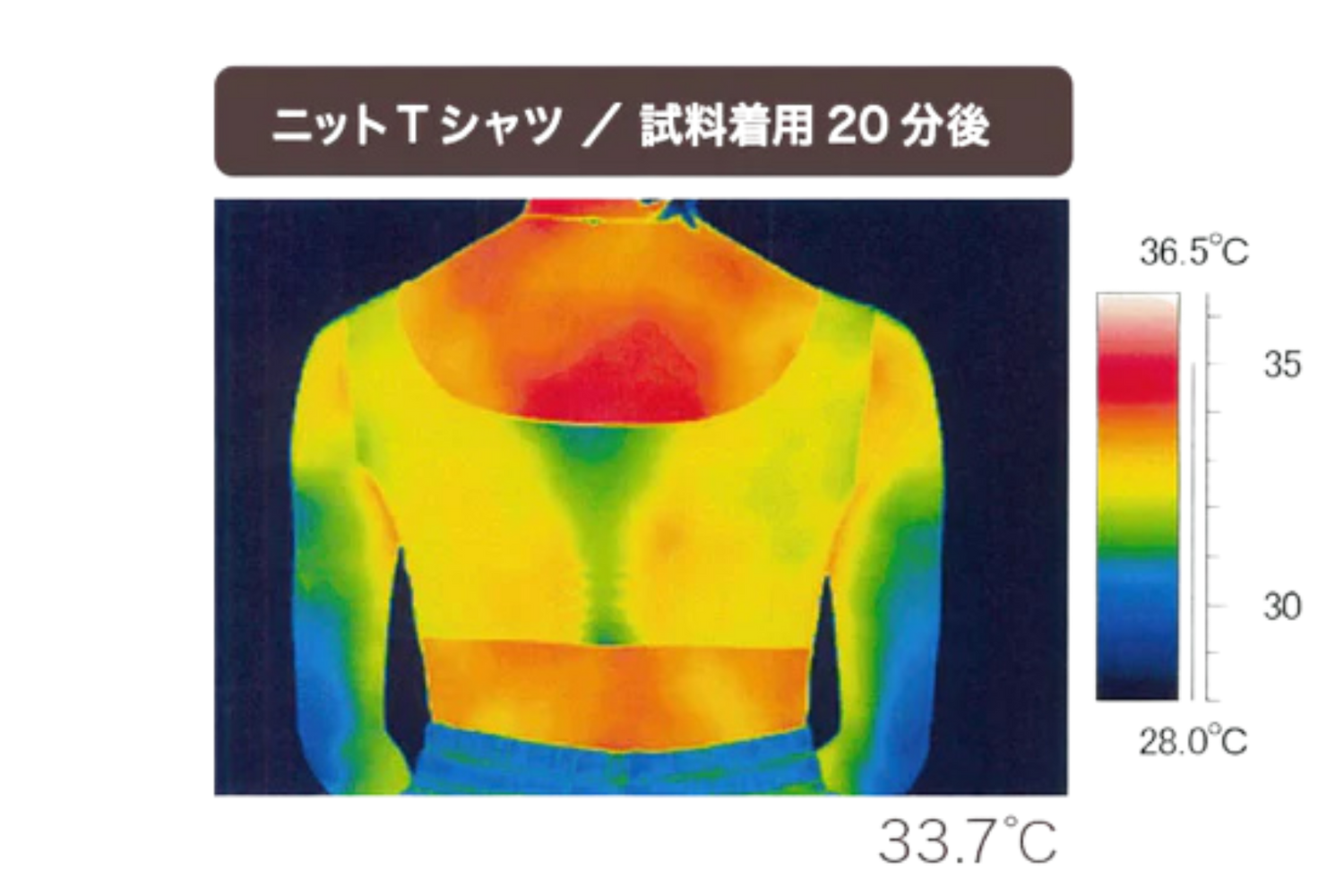 サーモグラフィの着用試験を行い、着用前と着用20分後を比較しました。他社綿Tシャツと比較し、保温効果が期待できます。
