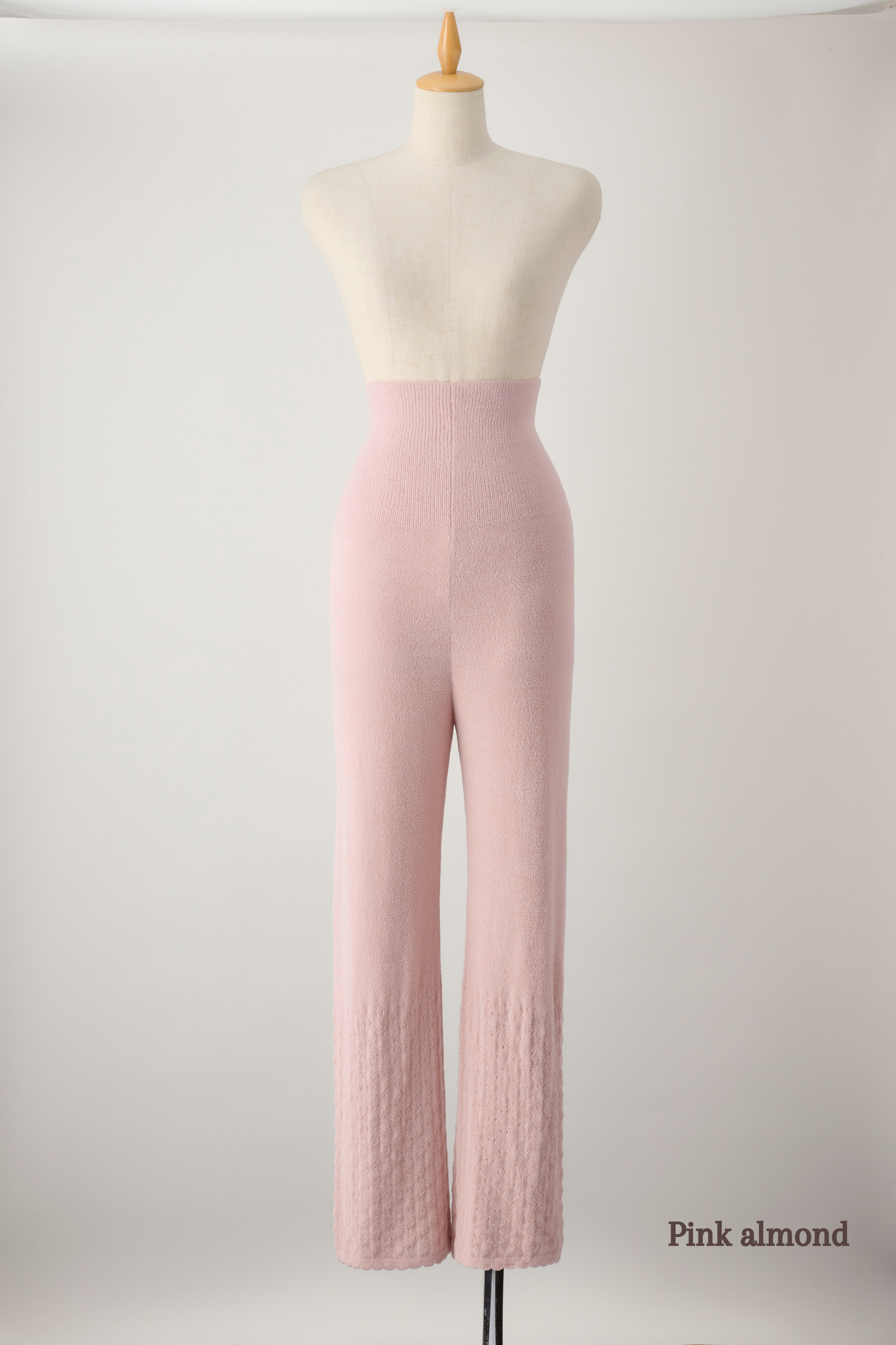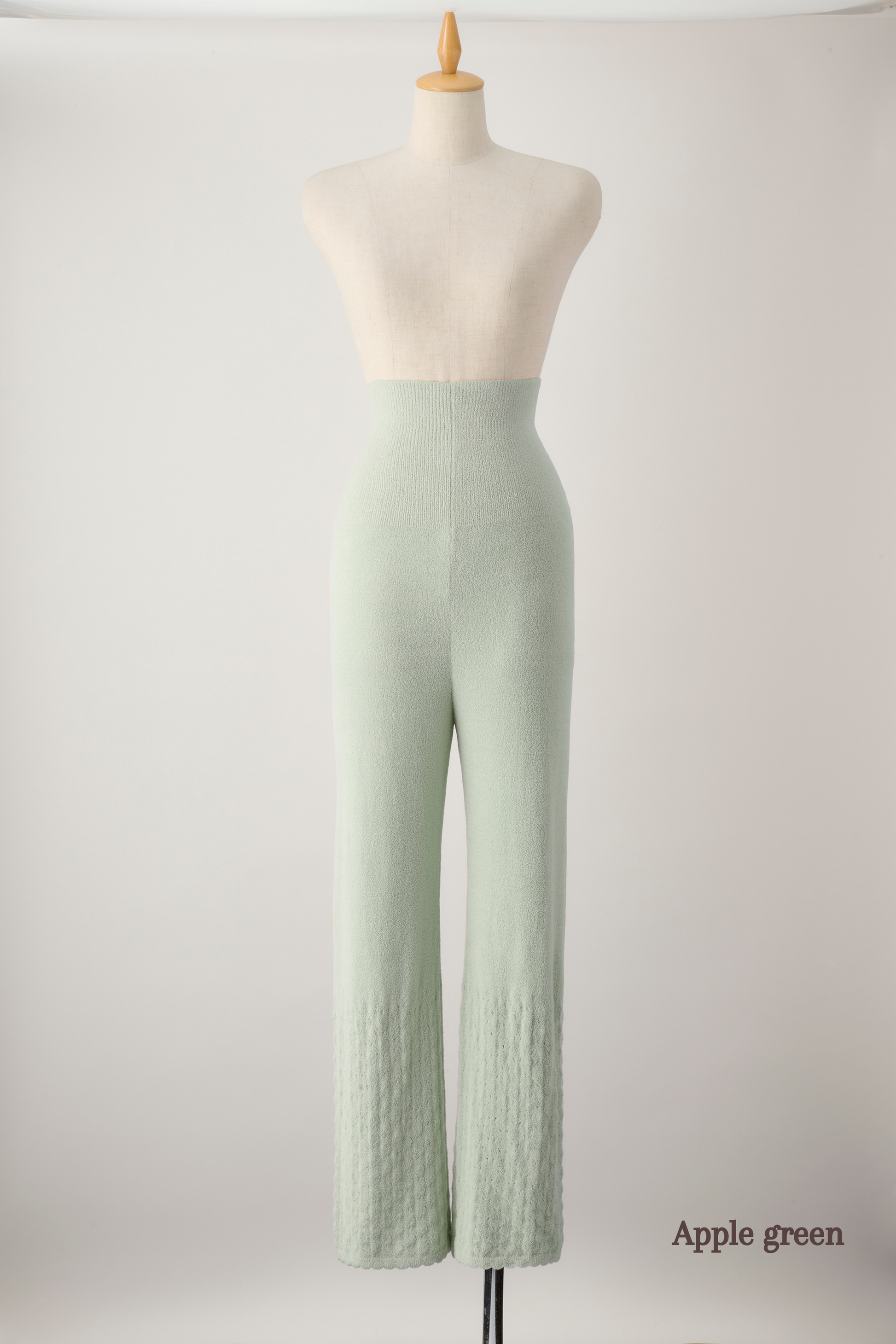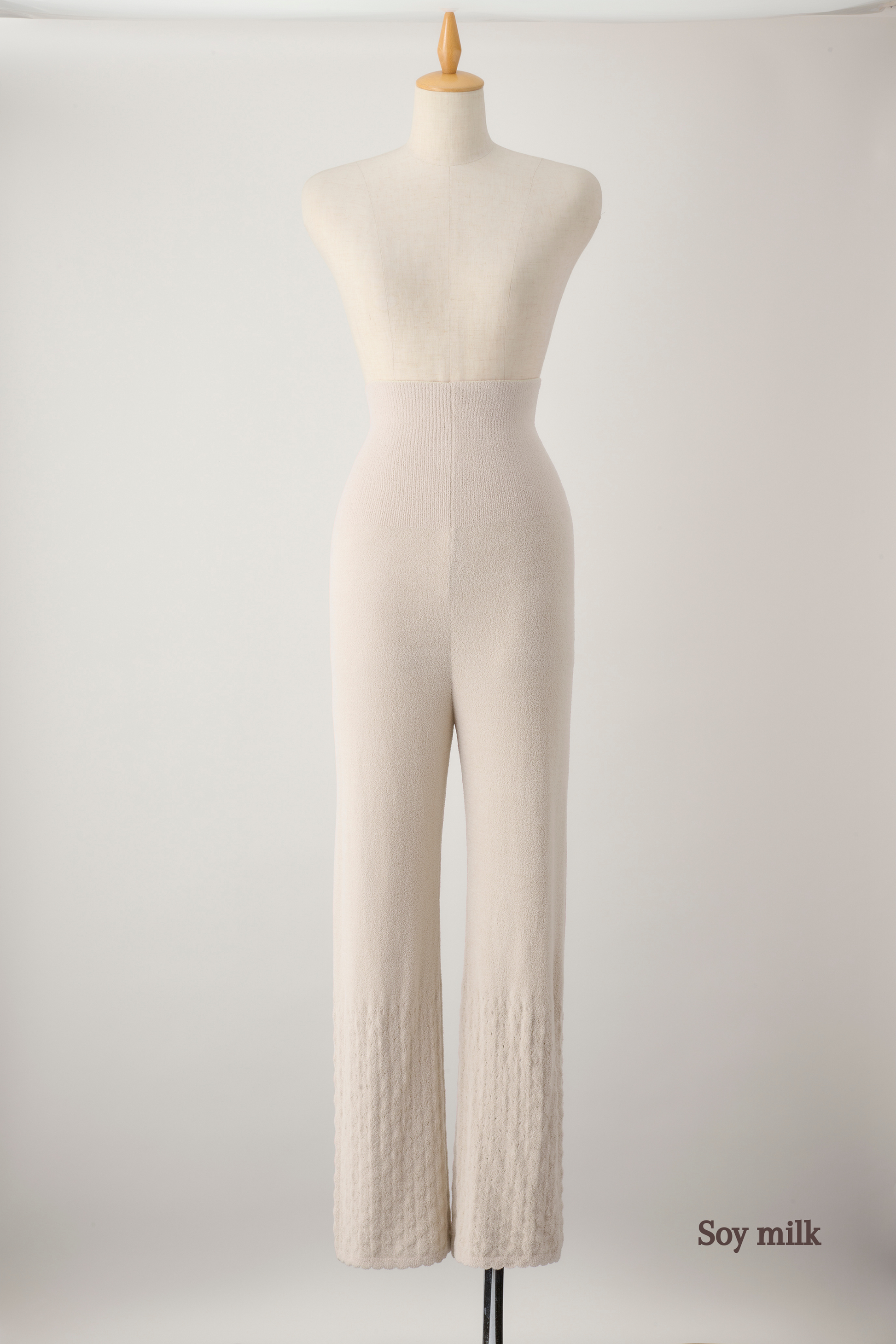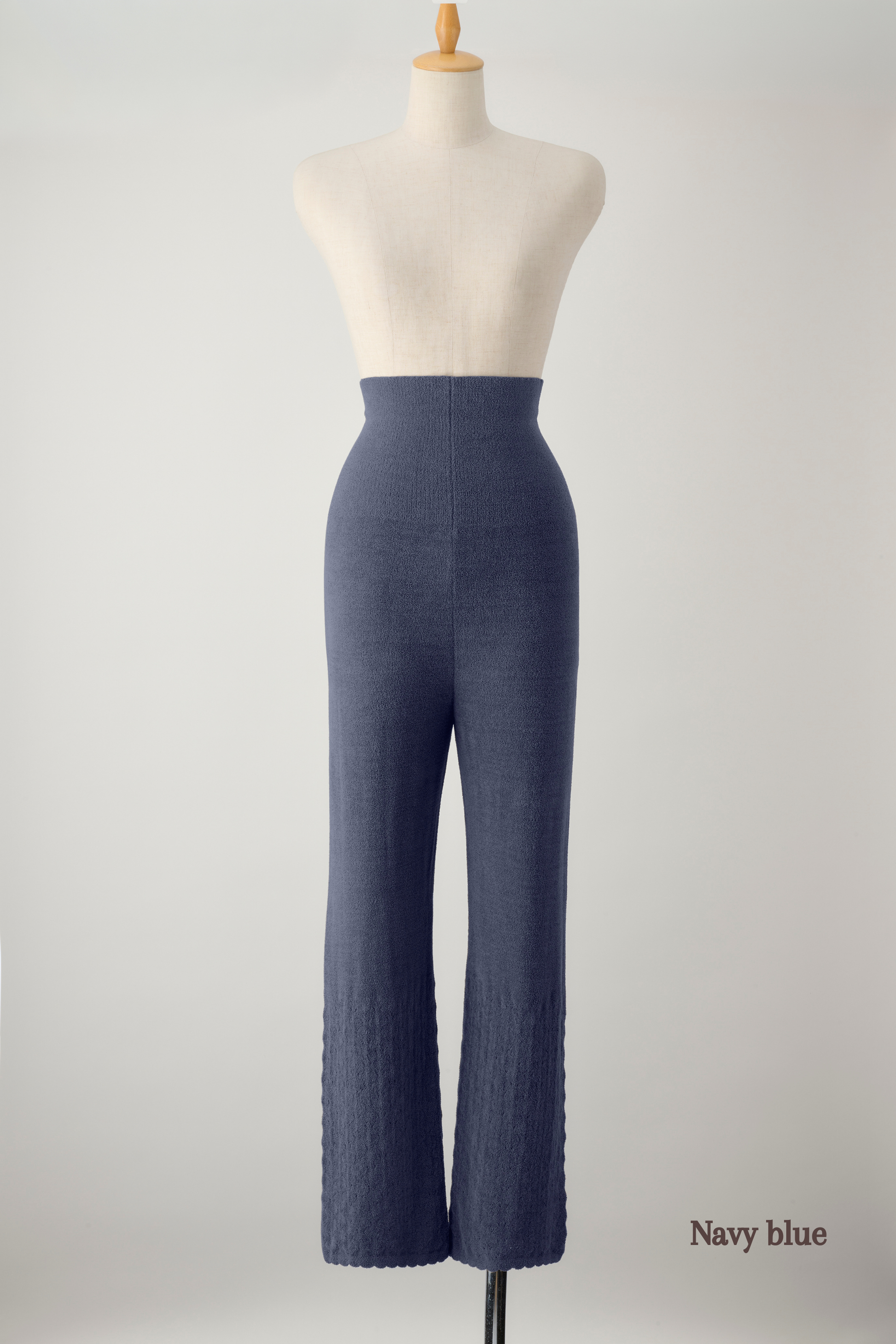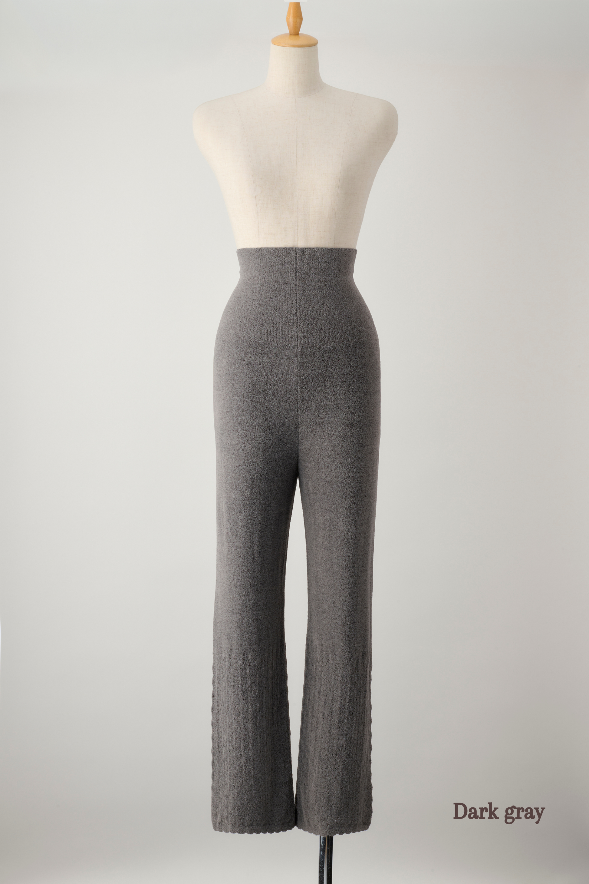 幅広のウエストは心地よい伸縮のリブ編みで、おなかに優しくフィットして温めます。