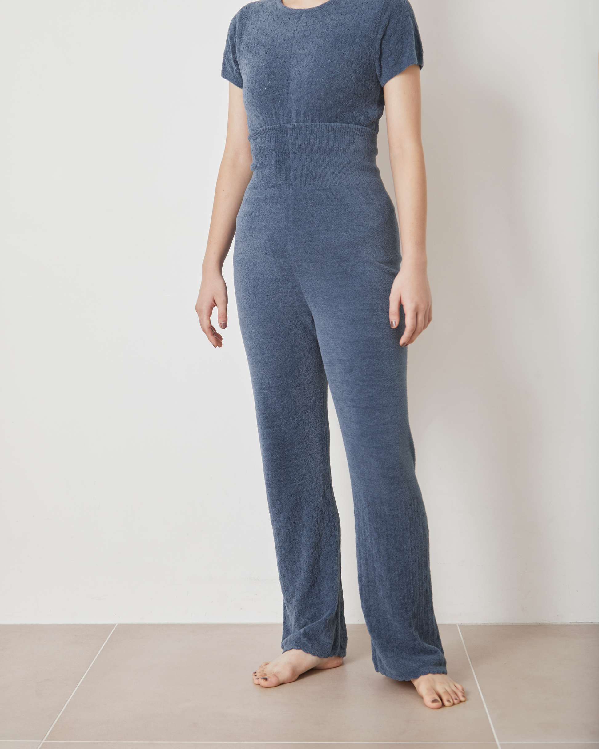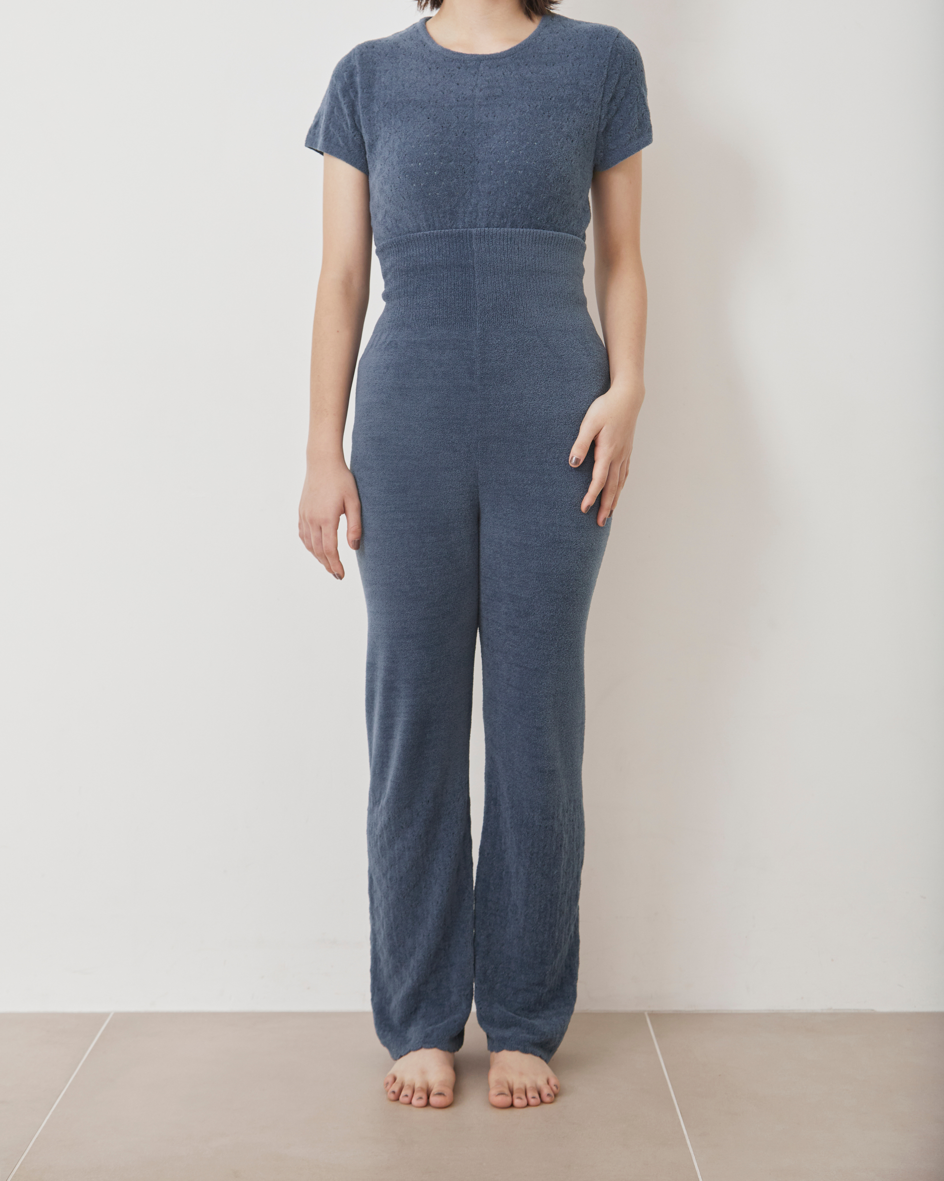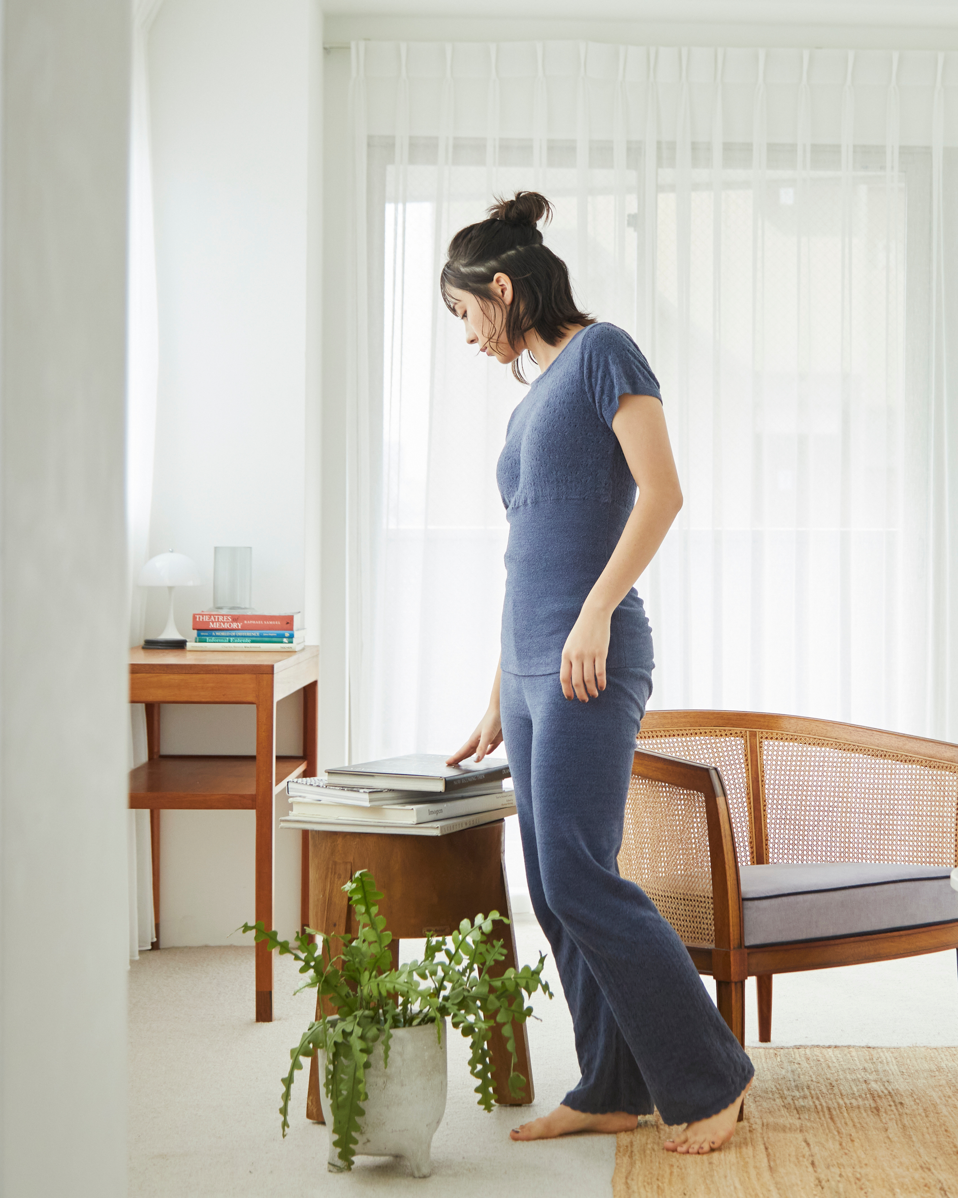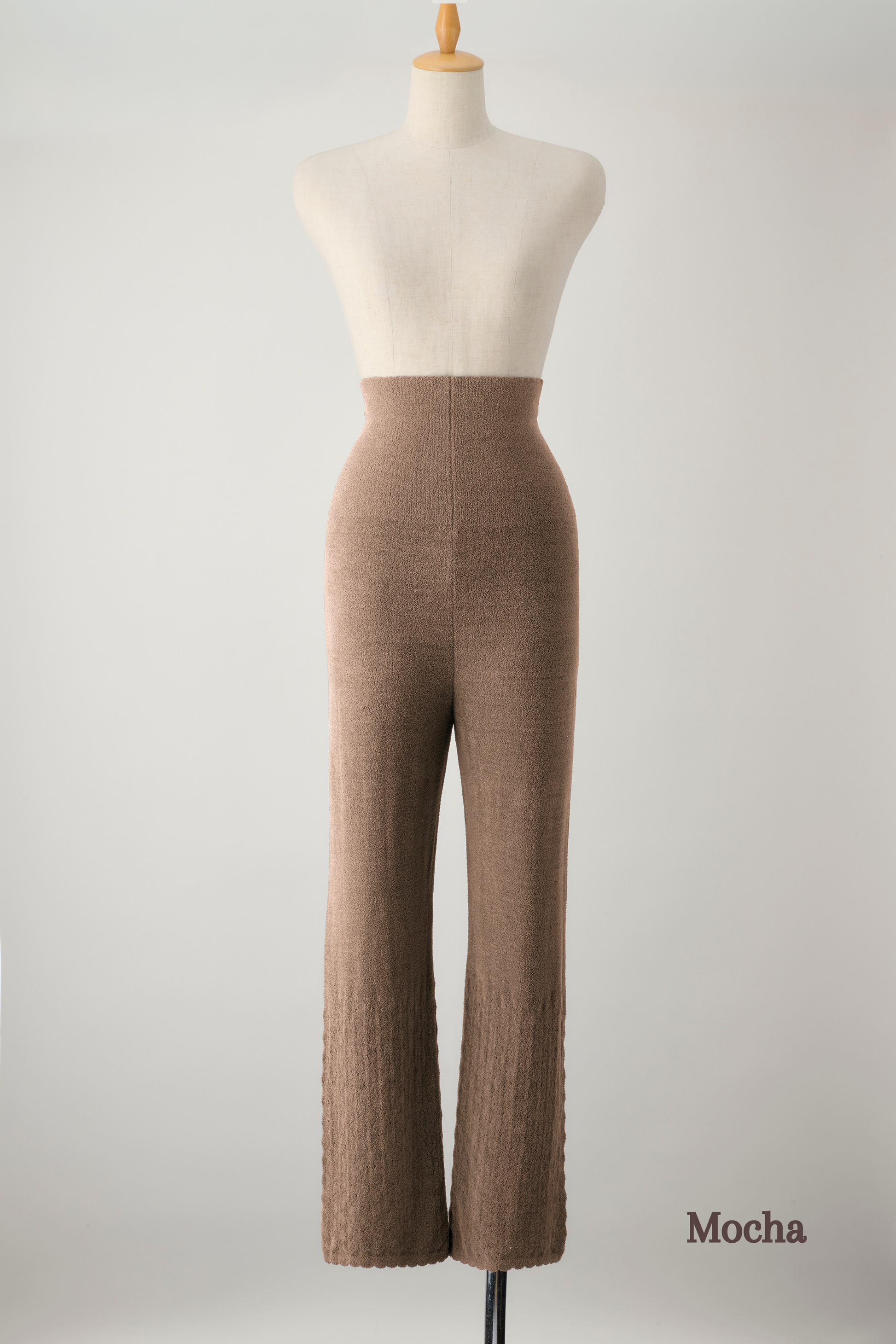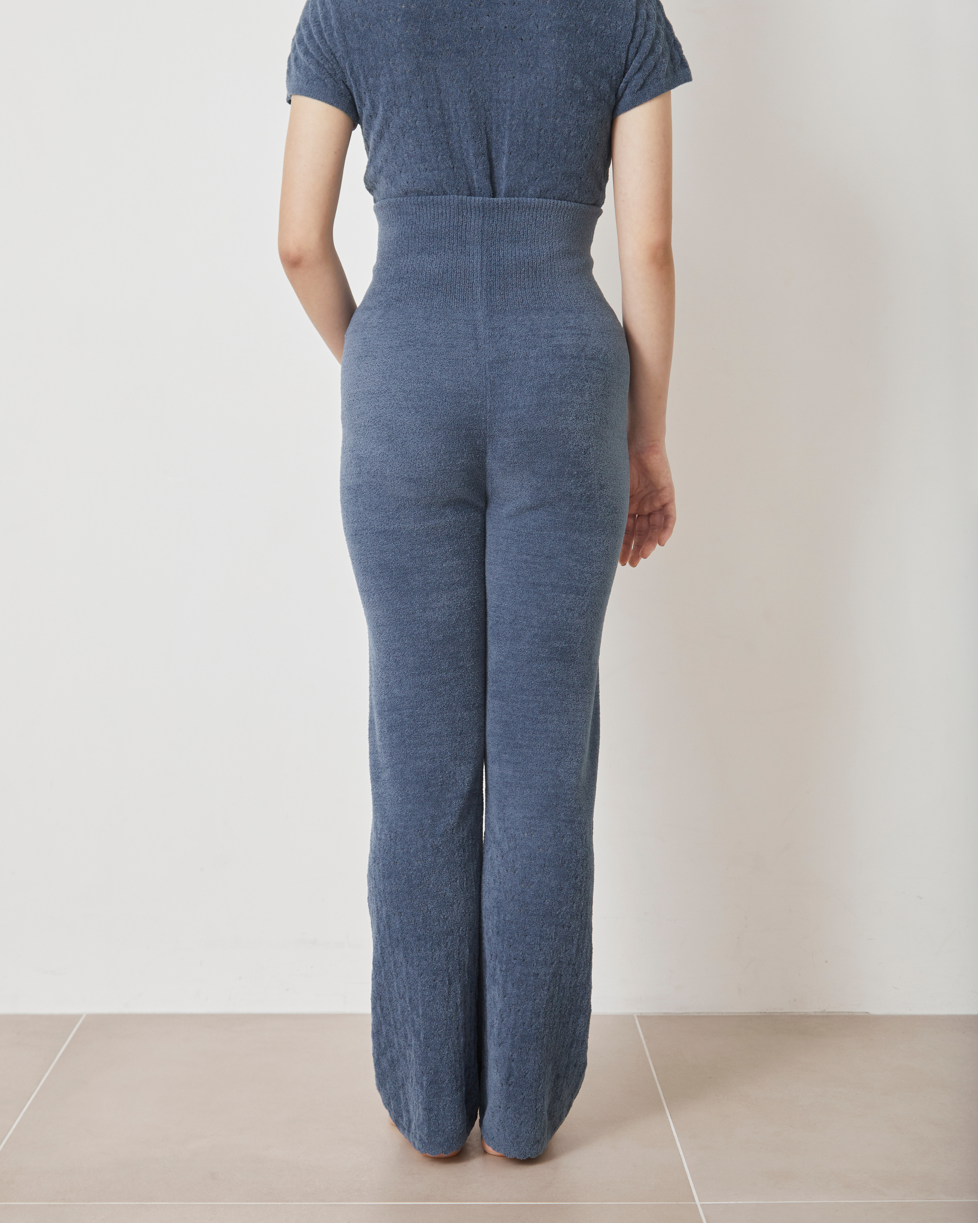 幅広のウエストは心地よい伸縮のリブ編みで、おなかに優しくフィットして温めます。